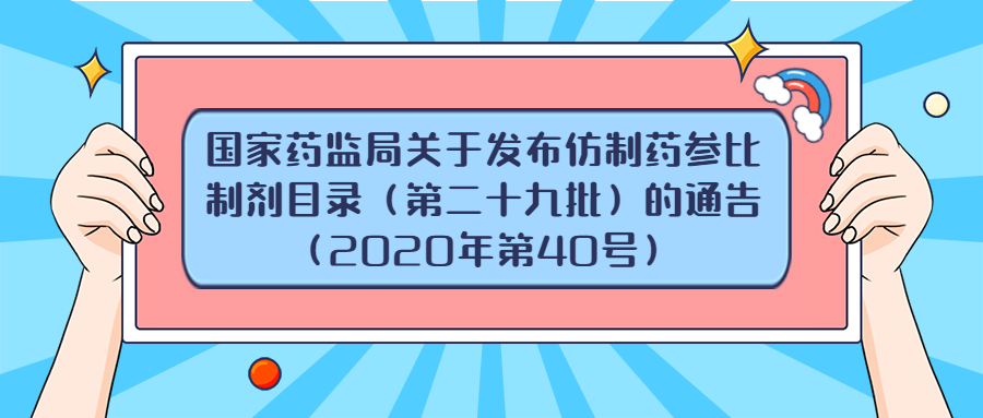 关于发布《化学仿制药参比制剂目录(第二十九批)》的公示 发布日期:20200519 根据国家局2019年3月28日发布的《关于发布化学仿制药参比制剂遴选与确定程序的公告》(2019年第25号),我中...
